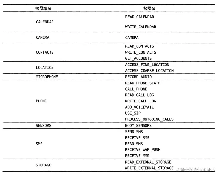 Android中有一共上百种权限,危险权限主要为以下9组24个权限,剩余的都是普通权限: