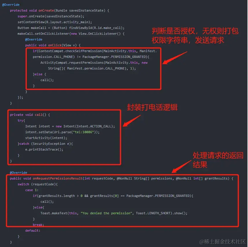 代码详细讲解: 上面的代码是申请运行时权限的完整流程,下面我们来具体解析一下;