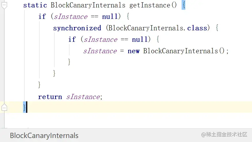 哦~BlockCanary的构造方法中, 调用了BlockCanaryInternals.getInstance();, 拿到一个BlockCanaryInternals实例,赋给类中的全局变量!BlockCanaryInternals.getInstance();同样是使用了单例模式, 返回一个BlockCanaryInternals实例:同样也是new时候调用了