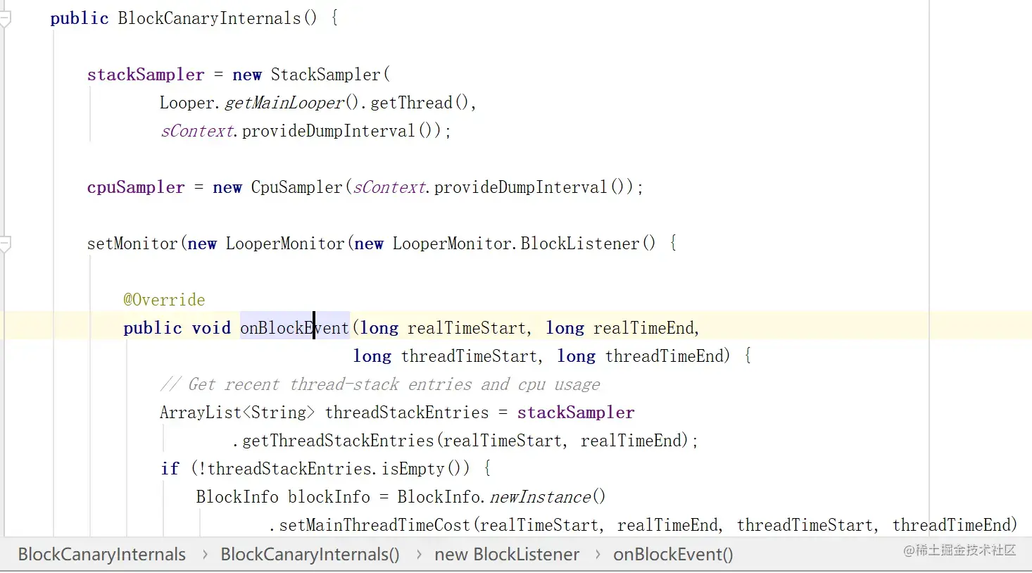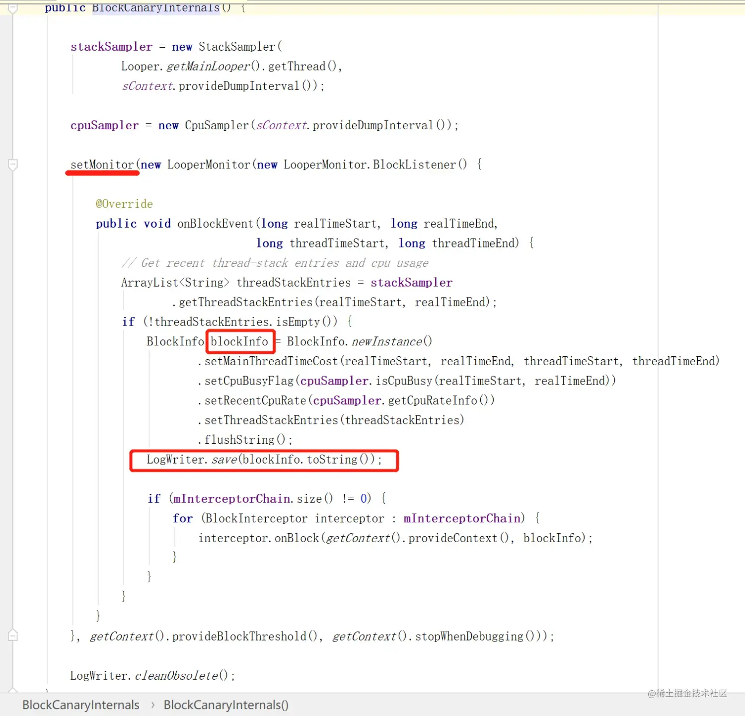 这个方法上面说了,在BlockCanaryInternals 的构造器中被具体实现了,
