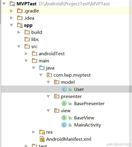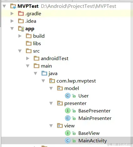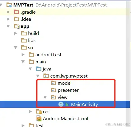 首先新建一个项目,在主包下创建三个包(即model、presenter、view),待会儿用于存放MVP三层各自的代码。然后把MainActivity.java拉进view包: