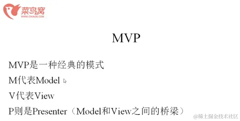 #####MVP模式的核心思想: 对比与MVC,把Activity中的UI逻辑抽象成View接口,把业务逻辑抽象成Presenter接口,Model类还是原来的Model类。 #####作用:
