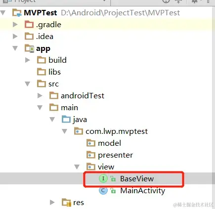 下面在View包下新建一个MainBaseView,代替原来BaseView的位置(MainActivity的UI逻辑接口), 抽取相同的部分放在BaseView中,MainBaseView和OtherBaseView继承BaseView: