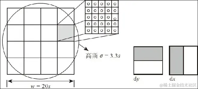 使用Haar在X方向与Y方向的2s×2s像素块响应,基于高斯权重分别计算dx、dy,最终可得到: