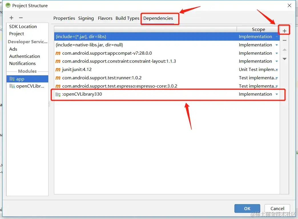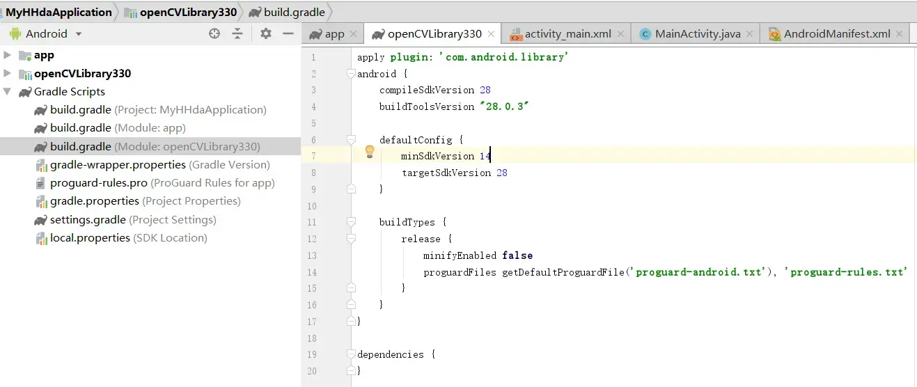 #####2.4 修改Gradle 脚本与编译 ######2.4.1 修改OpenCV库的build.gradle:  ``` apply plugin: 'com.android.library' android { compileSdkVersion 28 buildToolsVersion "28.0.3"