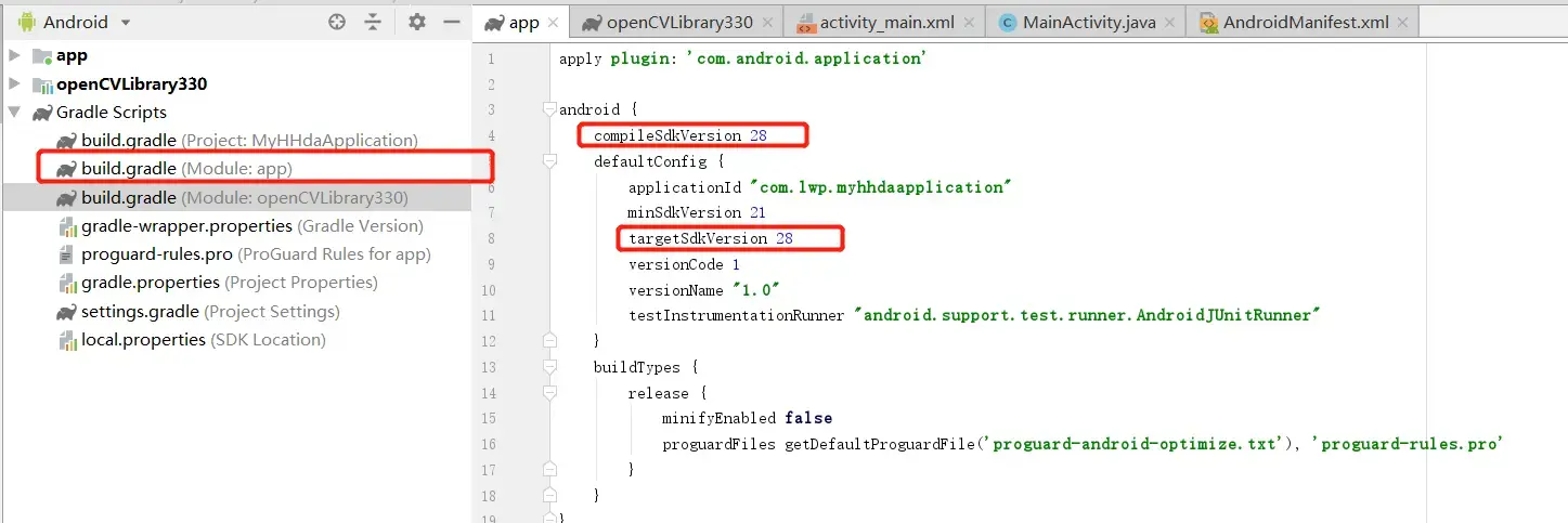 android { compileSdkVersion 28 defaultConfig { applicationId "com.lwp.myhhdaapplication" minSdkVersion 21 targetSdkVersion 28 versionCode 1 versionName "1.0" testInstrumentationRunner "android.support.test.runner.AndroidJUnitRunner" } buildTypes { release { minifyEnabled false proguardFiles getDefaultProguardFile('proguard-android-optimize.txt'), 'proguard-rules.pro' } } }
