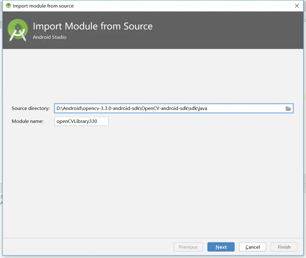 #####2.2**导入OpenCV Android SDK 依赖项** - 在Android Studio中, - 选择【File】>>【New...】>>【Import Module...】, - 打开对话框之后,选择刚刚解压缩好的OpenCV Android SDK 目录中的sdk\java, - 模块名称会自动显示出当前OpenCV的版本信息,如下如的Module name: