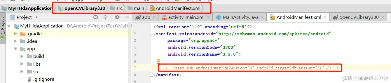 接着点击【Next】>>【Finish】,完成导入; 这里注意要把OpenCV库下面的AndroidManifest文件中的这一行代码注释掉,因为新版AS不允许这种写法(不删的话看报错就知道原因了):