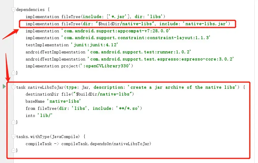dependencies { implementation fileTree(include: ['*.jar'], dir: 'libs') implementation fileTree(dir: "$buildDir/native-libs", include: 'native-libs.jar') implementation 'com.android.support:appcompat-v7:28.0.0' implementation 'com.android.support.constraint:constraint-layout:1.1.3' testImplementation 'junit:junit:4.12' androidTestImplementation 'com.android.support.test:runner:1.0.2' androidTestImplementation 'com.android.support.test.espresso:espresso-core:3.0.2' implementation project(':openCVLibrary330') }