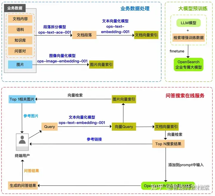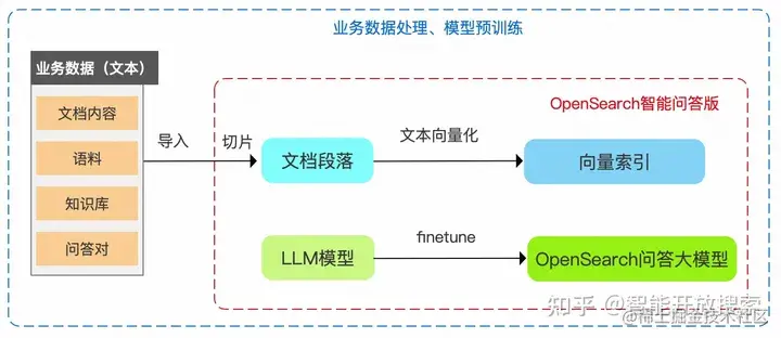 OpenSearch智能问答版系统架构主要包含业务数据处理、大模型预训练、问答搜索在线服务三个部分。