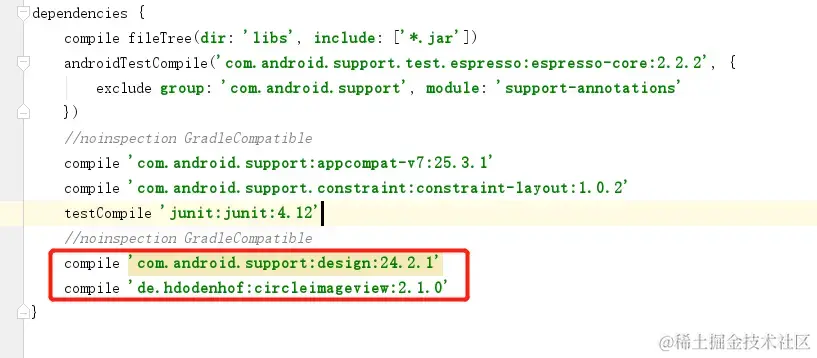 这里添加了两行依赖关系, 第一行就是DesignSupport库, 第二行是一个开源项目CircleImageView,它可以用来轻松实现图片圆形化的功能,我们待会就会用到它。 CircleImageView的项目主页地址是:github.com/hdodenhof/C…