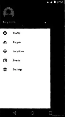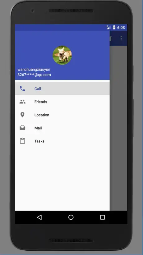 现在重新运行一下程序,然后在屏幕的左侧边缘向右拖动,就可以让滑动菜单显示出来了,如图: