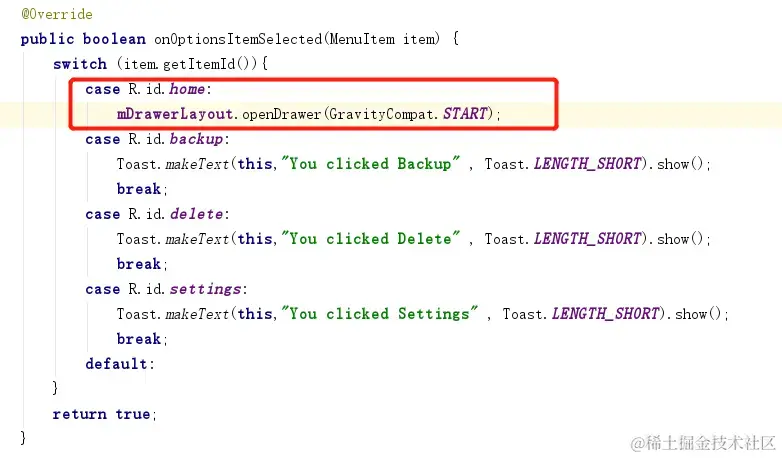 然后调用DrawerLayout的openDrawer()方法将滑动菜单展示出来; 注意openDrawer()方法要求传入一个Gravity参数,为了保证这里的行为和XML中定义的一致,我们传入了GravityCompat.START;