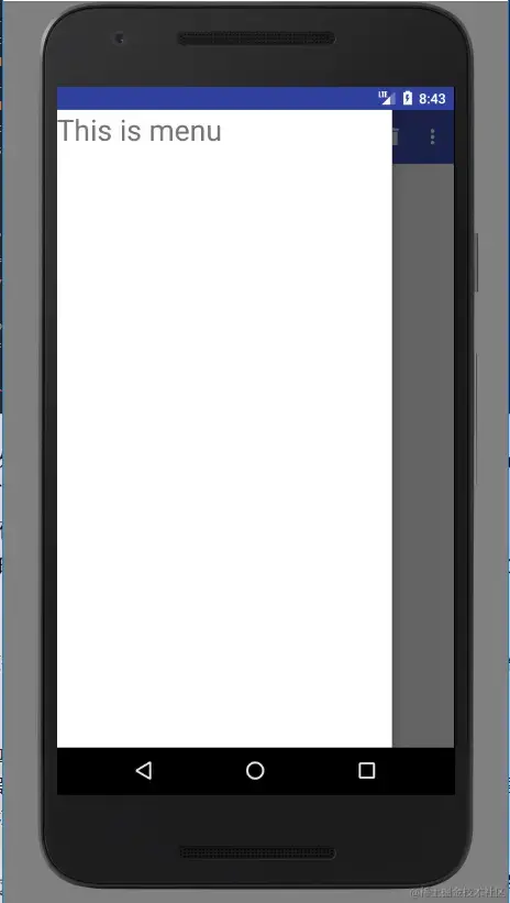 DrawerLayout中放置了两个直接子控件: 第一个子控件是FrameLayout,用于作为主屏幕中显示的内容,当然里面还有我们刚刚定义的Toolbar。 第二个子控件这里使用了一个TextView,用于作为滑动菜单中显示的内容,其实使用什么都可以,DrawerLayout并没有限制只能使用固定的控件。