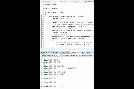 先运行上面程序中的类IServer, 该类运行后作为本应用的服务器,不会看到任何输出。接着可以运行多个 IClient——相当于启动多个聊天室客户端登录该服务器,此时在任何一个客户端通过键盘输入一些内容后单击“回车”键,将可看到所有客户端(包括自己)都会在控制台收到刚刚输入的内容,这就简单实现了一个聊天室的功能。 -