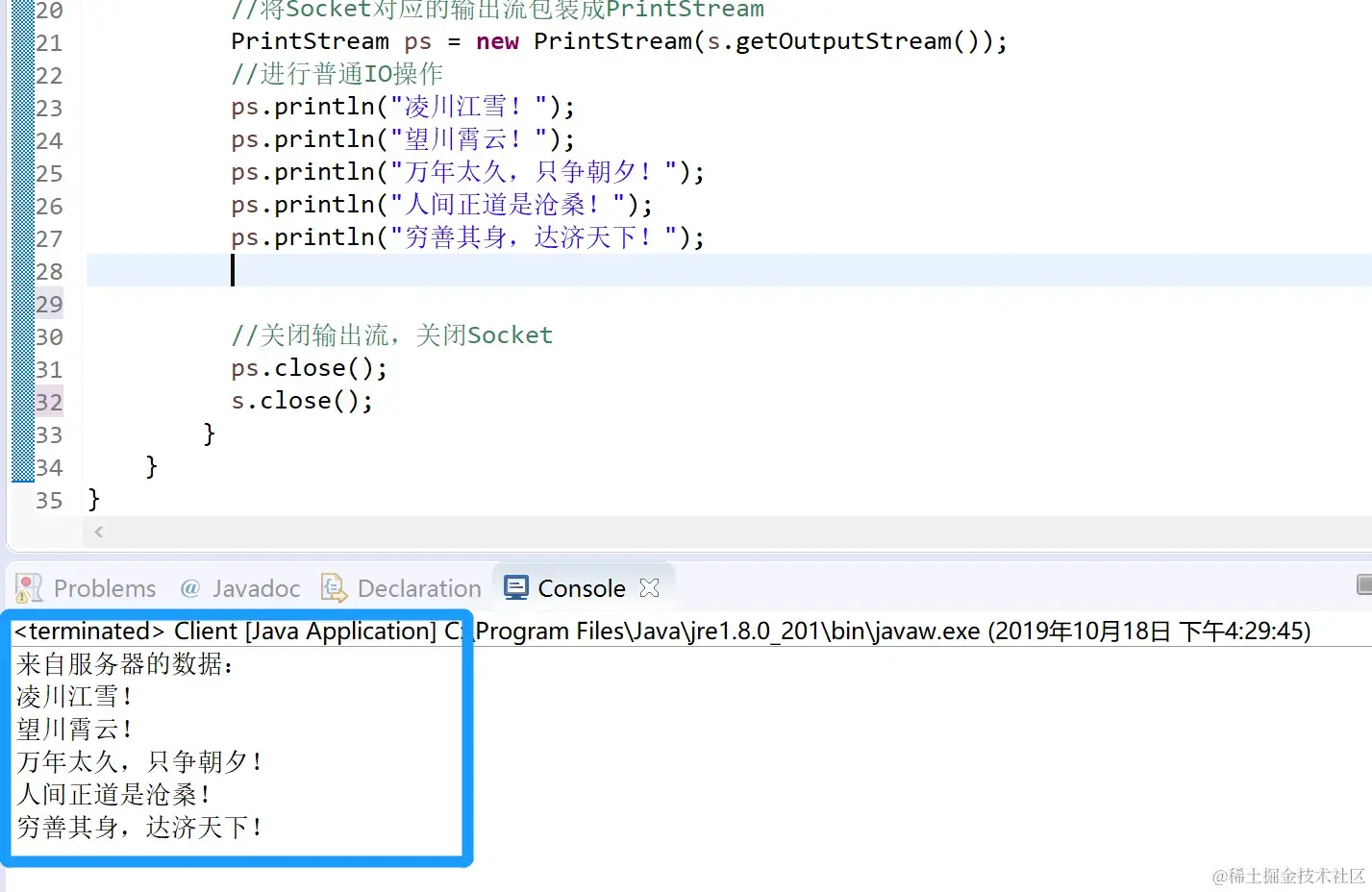 上述代码使用Socket建立了与指定IP、指定端口的连接, 并使用Socket获取输入流读取数据, 之后处理一下数据然后打印在工作台。