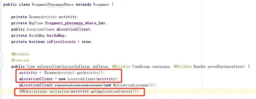 2. Activity和ApplicationContext,要区分清楚;这里是在碎片中调用Activity和ApplicationContext对象, LocationClient()需要的参数是Activity,SDKInitializer.initialize()需要的是ApplicationContext;  ``` activity = (DrawerActivity) getActivity(); mLocationClient = new LocationClient(activity); mLocationClient.registerLocationListener(new MyLocationListener()); SDKInitializer.initialize(activity.getApplicationContext()); ```
