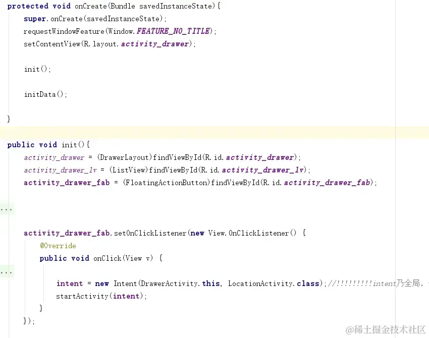 像上图这种,intent就该放在onClick()里边(如果别处有赋值的话),**什么状态对应什么回调方法+对应什么跳转,这三者是一气呵成的,别拆开,**像上图,intent的new如果放在onClick之外init之内,就有bug了。