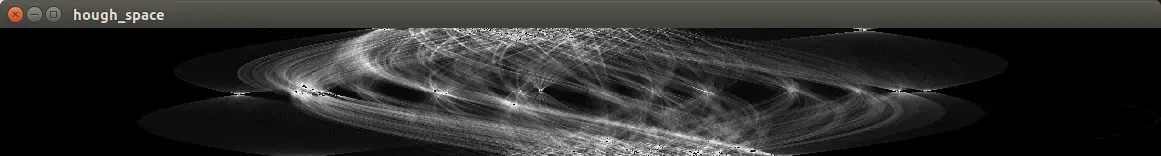 存在边缘对象中的对应的直线在极坐标空间中的参数方程的参数, 这样就在极坐标空间找到了直线的参数方程,反变换回到平面坐标空间就可以求得直线的两个参数(k,b), 得到直线位置, 而它们在极坐标的交点就是直线在霍夫空间的表达, 直线越长,其在霍夫空间这个点的累积值就越高,相对的灰度值也就越(亮)。