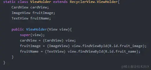 onCreateViewHolder中把整个xml文件内容作为一个View实例加载进来, 一般这个View实例的内容 仅是一个View或者是一个包含了很多View的ViewGroup, 把这些View或者和ViewGroup都分别指定成一个个实例, 作为ViewHolder的全局对象存储在ViewHolder中;在