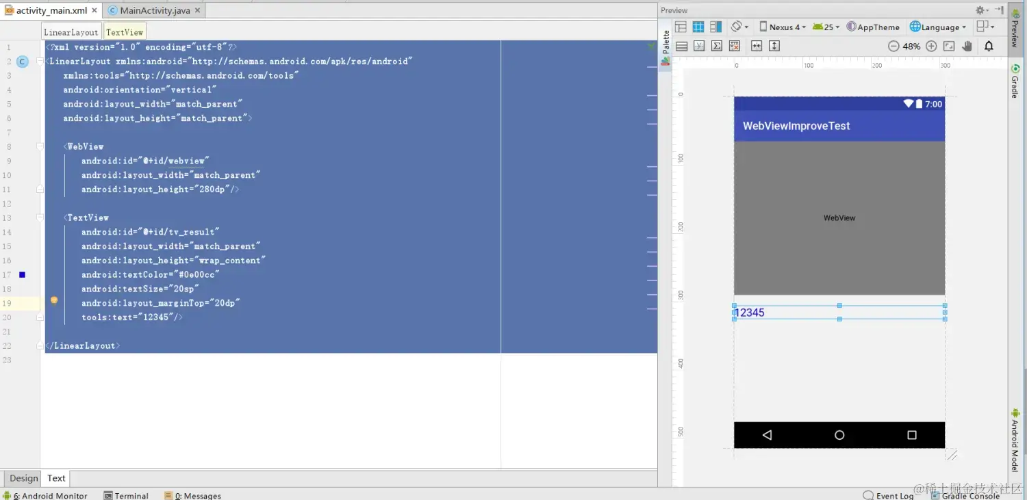 使用tools:text跟使用android:text的区别就是使用tools:text的时候,text的内容只在布局预览中存在,而在真正运行的时候是不存在的; Textview里边使用android:layout_marginTop="20dp",让其与WebView保持距离。