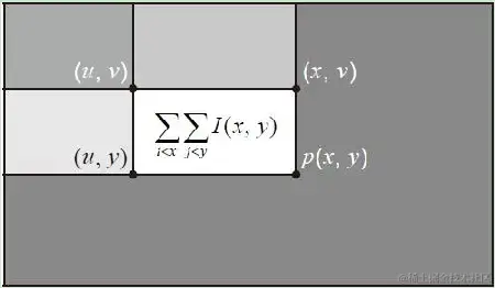积分图是Crow于1984年首次提出的,其目的是为了在多尺度透视投影中提高渲染速度。随后这种技术被应用到基于NCC的快速匹配、对象检测、SURF变换和基于统计学的快速滤波器等方面。积分图像是一种在图像中快速计算矩形区域和的方法,这种算法的主要优点是一旦积分图像首先被计算出来,就可以计算图像中任意大小矩形区域的和,而且是在常量时间内。这样在图像模糊、边缘提取、对象检测的时候就能极大地降低计算量、提高计算速度。第一个应用积分图像技术的应用是在Viola-Jones的对象检测框架中出现的。1.积分图基本原理 对于方框模糊来说,当我们需要求出指定方框的均值时,首先需要计算其和,而这个是最耗时的操作,方框越大耗时越长,原因就在于这些计算存在着大量的重复计算。而积分图则能做到计算一次,后续查找和表完成替代计算,这样就大大简化了计算的复杂度,提高了程序执行的时间。假设有如下的图像I,其积分图为II,对于给定任意矩形范围大小的像素之和都可以通过矩形的四个点左侧上方的像素块组合加减得到。假设矩形右下角的点为P(x,y),左上角的点为P(u,v),则可以通过如下公式最终得到矩形块像素: sum(x,y)=ii(x,y)+ii(u,v)-ii(x,v)-ii(u,y) 其中,矩形大小为m×n,m=x-u,n=y-v,
