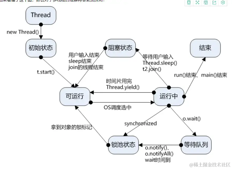一旦线程进入了就绪状态, 就会在就绪与运行状态间转换, 同时也可能进入等待、休眠、阻塞或死亡状态;