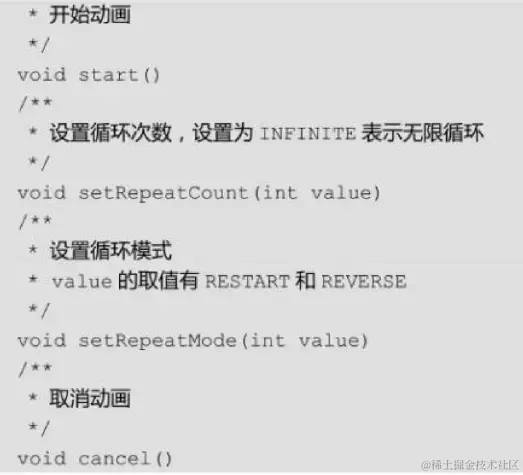 注意:重复次数为INFINITE(无限循环)的动画, 当Activity结束的时候,必须调用cancel()函数取消动画, 否则动画将无限循环,从而导致View无法释放, 进一步导致整个Activity无法释放,最终引起内存泄漏。