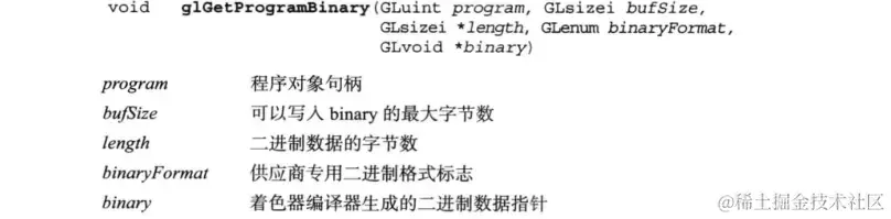 编译和链接程序 之后, 使用glGetProgramBinary检索程序二进制代码: -