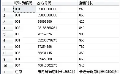 -- 5) 输出所有数据的拨号流水,并且在最后一行添加总呼叫时长。 -- 记录呼叫员编号、对方号码、通话时长 --... -- 汇总[市内号码总时长][长途号码总时长]