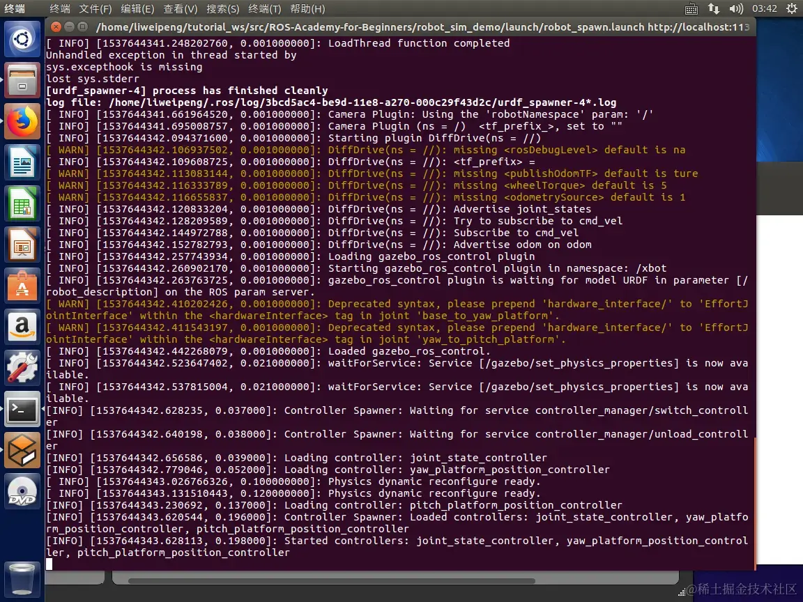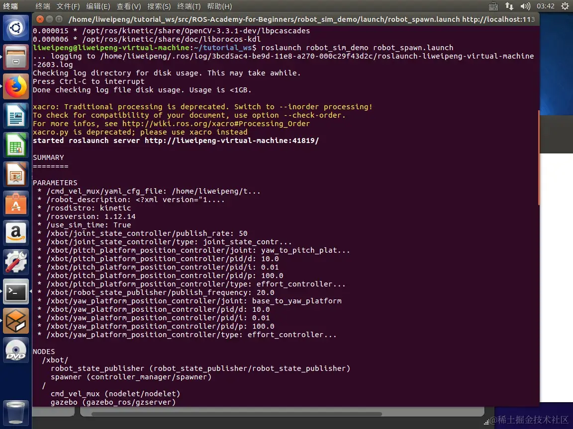 liweipeng@liweipeng-virtual-machine:~$ roslaunch robot_sim_demo robot_spawn.launch