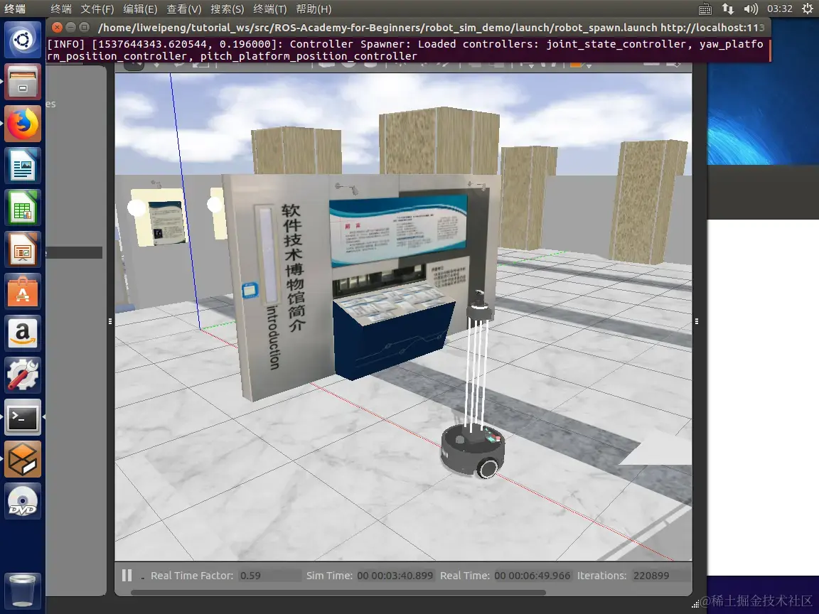 下面是运行过程图(是的,一开始可能会遇到一个报错[robot_spawn.launch] is neither a launch file in package [robot_sim_demo] nor is [robot_sim_demo] a launch file name The traceback for the exception was written to the log file,然而下面的过程图已经是从报错到解决报错成功运行的过程了):