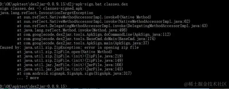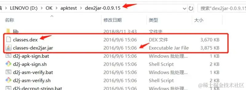 这个文件就是源代码打包后的文件,将它复制到第二个解压工具dex2jar-0.0.9.15的根目录下,然后在cmd窗口使用cd命令进入工具dex2jar-0.0.9.15的目录并执行下面的代码: