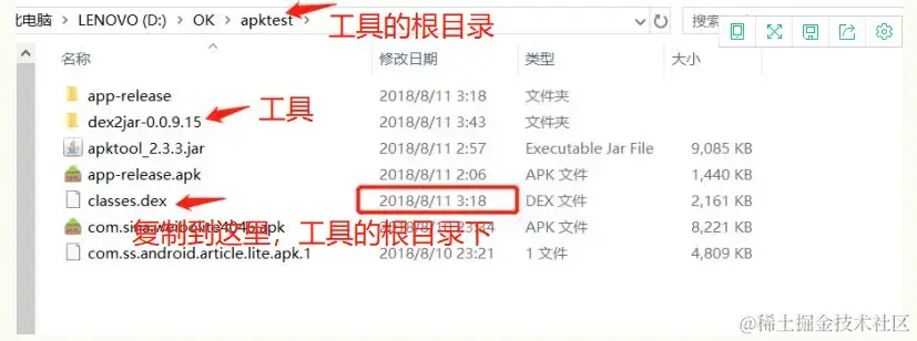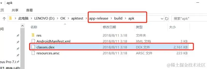 先回到刚刚用解压缩工具apktool解压apk后、重新打包后得出来的那个build文件夹,文件夹中有一个非常重要的文件,如下图的classes.dex文件: