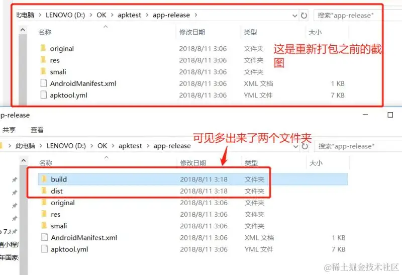 重新打包的命令与解码的命令相似,只是将d改为b,并选择前面解码生成的文件夹。执行该命令后,在文件夹下就会生成两个新的文件夹,如下图所示dist和build文件夹,重新打包的APK就在dist目录下:
