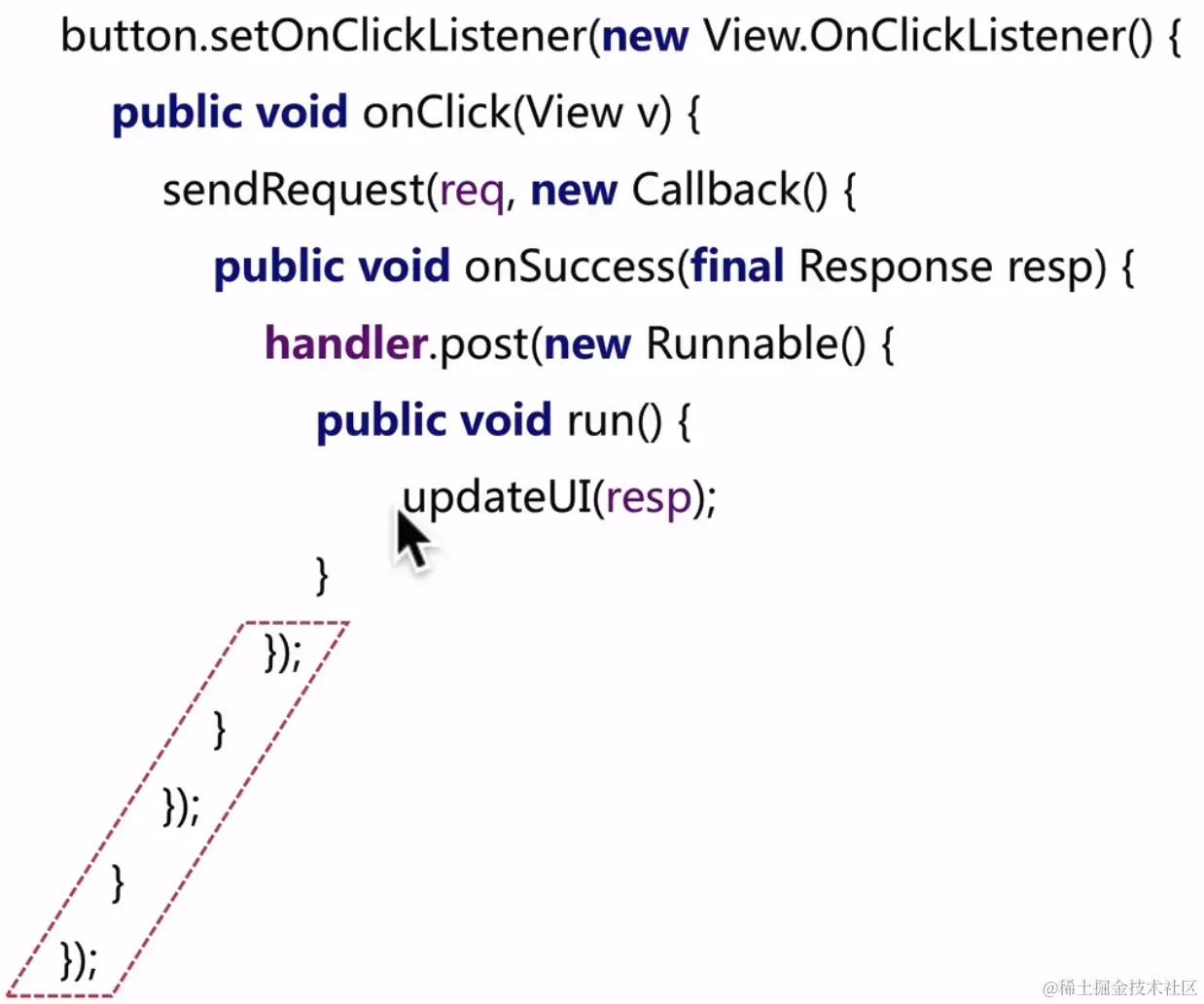过多层的回调嵌套的现象,称之“回调地狱”; 其实onSuccess中操作无非是想要切回主线程去更新UI, 这种的话, 其实可以在sendRequest中完成“切回主线程”的任务的, 在sendRequest的编写中, 使用一个绑定了MainLooper的Handler,把操作切回主线程进行即可, 调用的话可以使用new Callback()这里的接口参数去抽象调用; 类似的可以参考一下笔者的博客,如 Android | UDP的C(Java|Android)/S(Java)通信实战案例中的UdpClientBiz.class或者 Android | TCP的C(Java|Android)/S(Java)通信实战经典聊天室案例中的TcpClientBiz; 避免产生 如上图中的过多层的回调嵌套!!!;