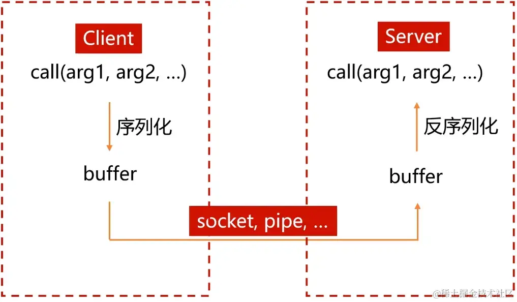 - 首先,Client端要调用Server端的某个函数(如这里的call()函数); 做法是首先把参数序列化到一个buffer, 然后通过Linux的各种跨进程通信方式传到Server端的buffer,