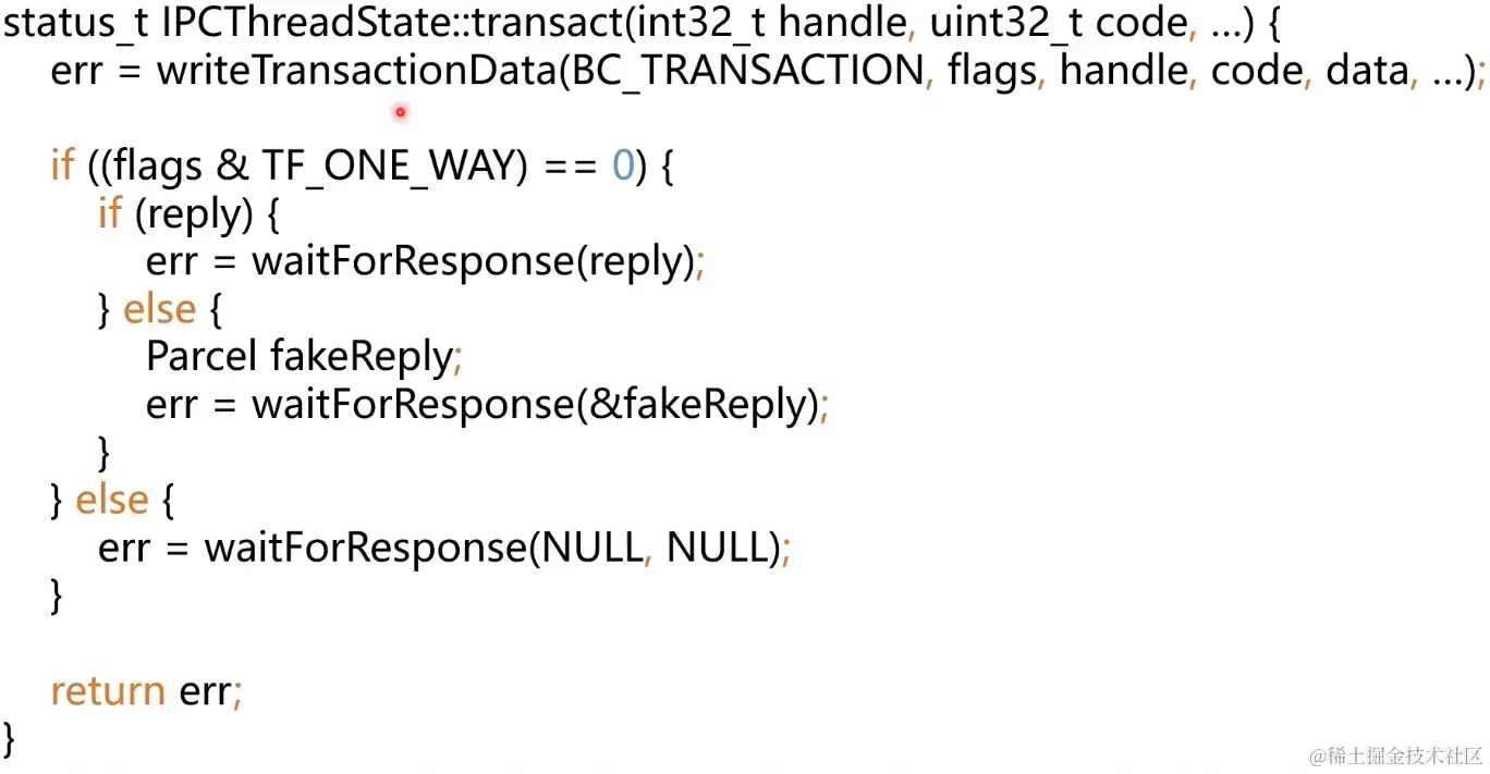 函数中, 首先判断一下传进来transact()的flags, 如果是TH_ONE_WAY, 就不用等回复了,两个相关参数都传NULL; (waitForResponse(NULL,NULL)) 如果不是TH_ONE_WAY, 就需要有一个reply来接收回复, 调用时有传进来reply,则用调用传进来的reply, 没有传进来的,则临时创建一个Parcel来充当reply;