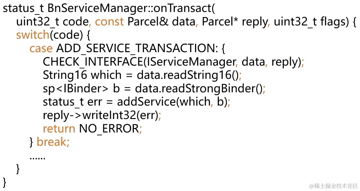 swich(code)找到ADD_SERVICE_TRANSACTION这个case, 然后从Pacel里面, 把系统服务的binder读出来(data.readStrongBinder();), 读出来的是 根据binder引用对应的handle值封装的一个BinderProxy对象;- 接着调用本地的