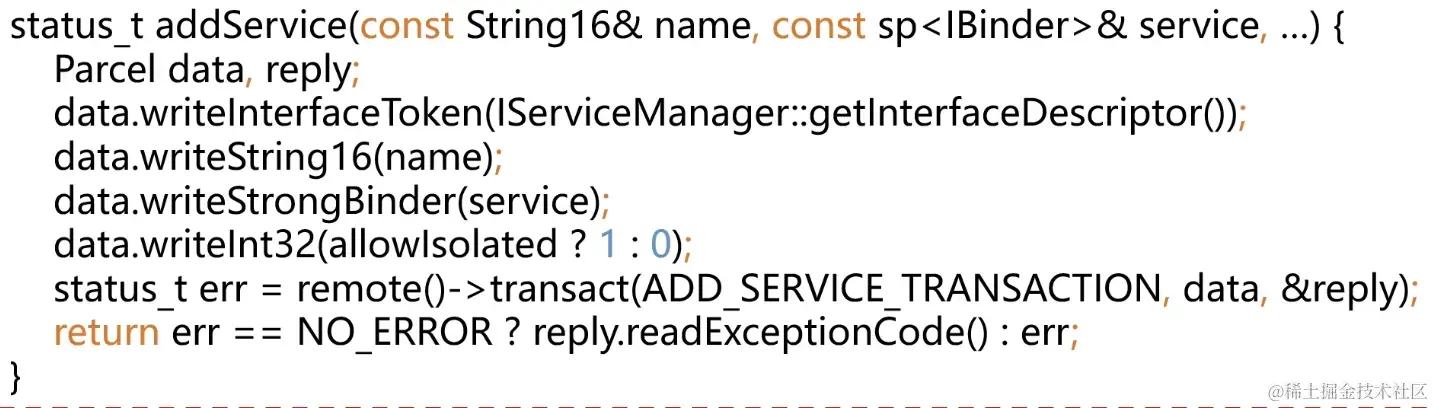 addService函数, 把刚刚取出来的系统服务binder存好;- 上面讨论过了,