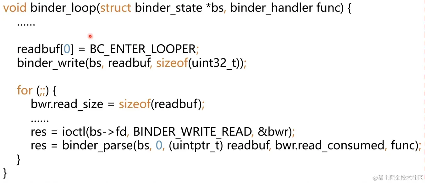 BINDER_WRITE_READ,看起来好像是又写又读, 但其实我们看bwr_read_size是大于0的, 而write_size没有赋值,所以这里是读, 把binder驱动发过来的数据、请求读进来;(ioctl()) -