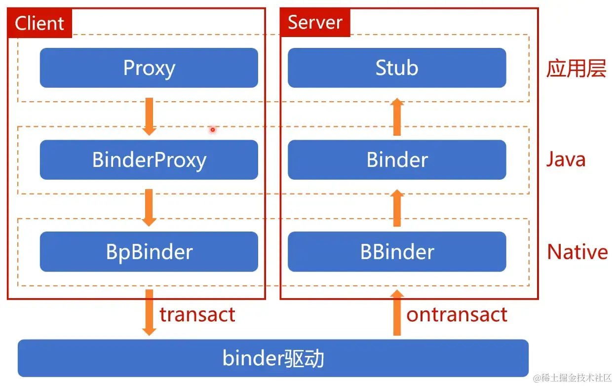 Client端开始看, 当我们拿到一个Binder对象的Proxy的时候, 我们要发起IPC调用了; 这个调用其实就是把请求往下 丢给了BinderProxy; 请求继续往下走,又会丢到Native层的Proxy--BpBinder对象; 然后这个BpBinder对象,又会把请求 转交给IPCThreadState, 通过IPCThreadState的transact函数, 发送请求到Binder驱动; -