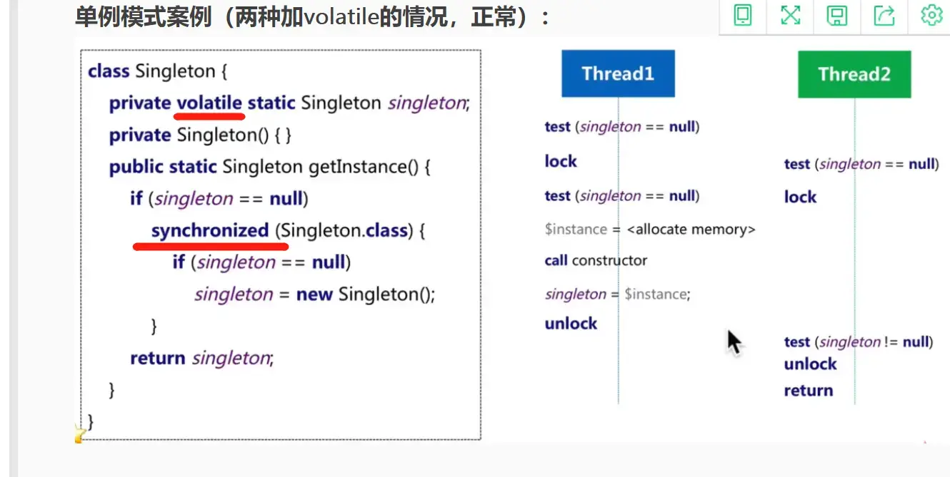 只需要将`sInstance`的定义改成`private volatile static Singleton sInstance = null`就可以保证sInstance对象`每次都是从主内存中读取`,