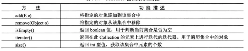 ####2. Collection接口 - Collection接口是层次结构中的根接口; - 构成Collection的单位称为```元素```; - Collection接口通常不能直接使用,但该接口提供了```添加元素、删除元素、管理数据```的方法。 - 由于List接口与Set接口都继承了Collection接口,因此这些方法对List集合与Set集合是通用的。 常用方法如下表: