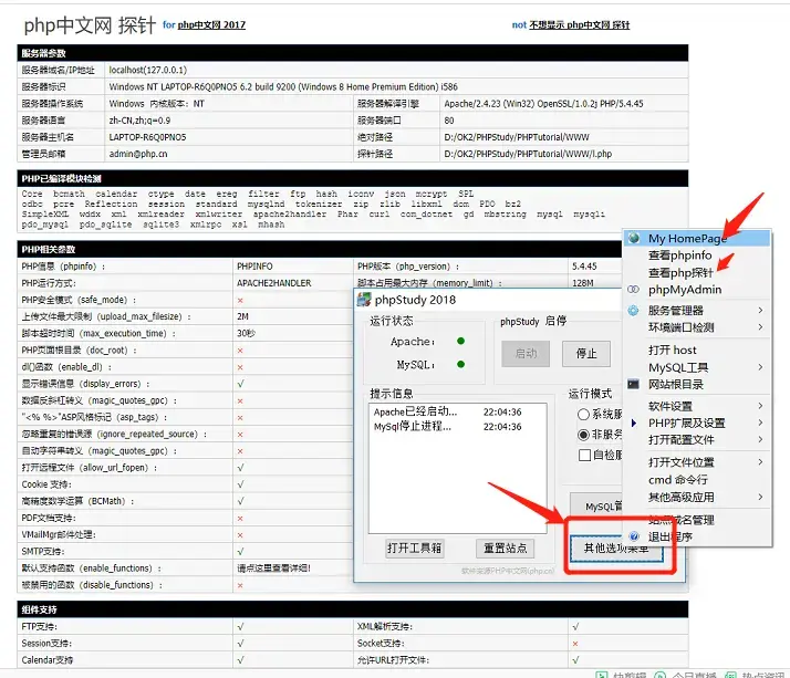 点击其他选项菜单,菜单中选择My HomePage或者查看php探针,成功弹出网页,如下图的php中文网探针,即表示集成环境是成功安装并运行了: