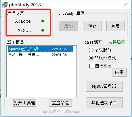 至此,我们的PHPstudy集成开发环境便安装完成并启动成功了。