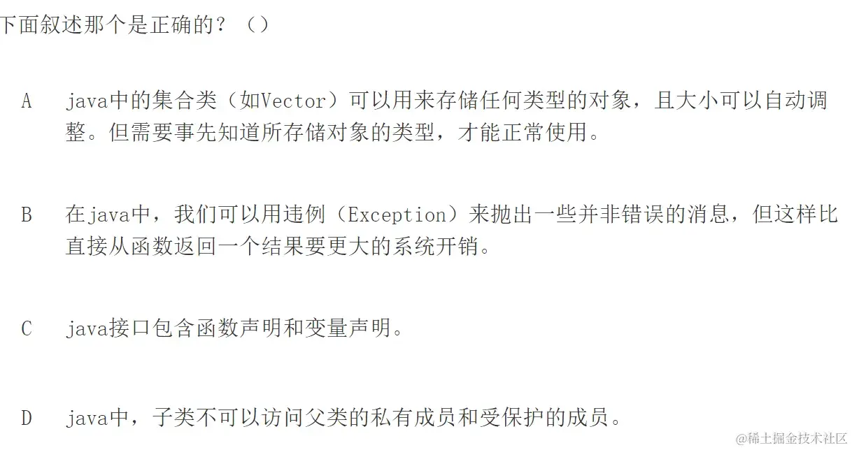 C选项是错误的,因为接口中不能声明变量,只有常量!接口中只有常量定义,没有变量声明。 接口中方法默认是abstract public, 所以在接口只写函数声明是符合语法规则。 但是变量默认是用public final static 修饰的, 意思它是静态常量,不是变量! 另外, 常量不管在接口中还是类中必须在声明时初始化。