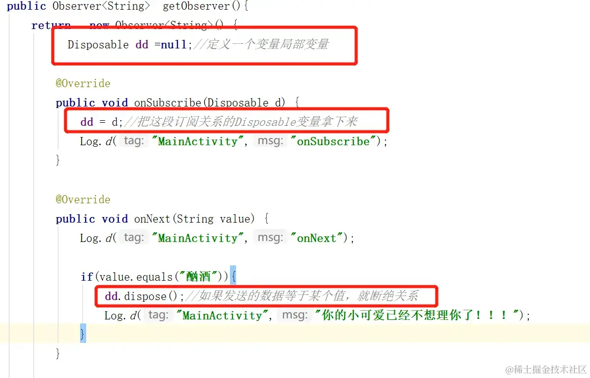 dd = d;//把这段订阅关系的Disposable变量拿下来