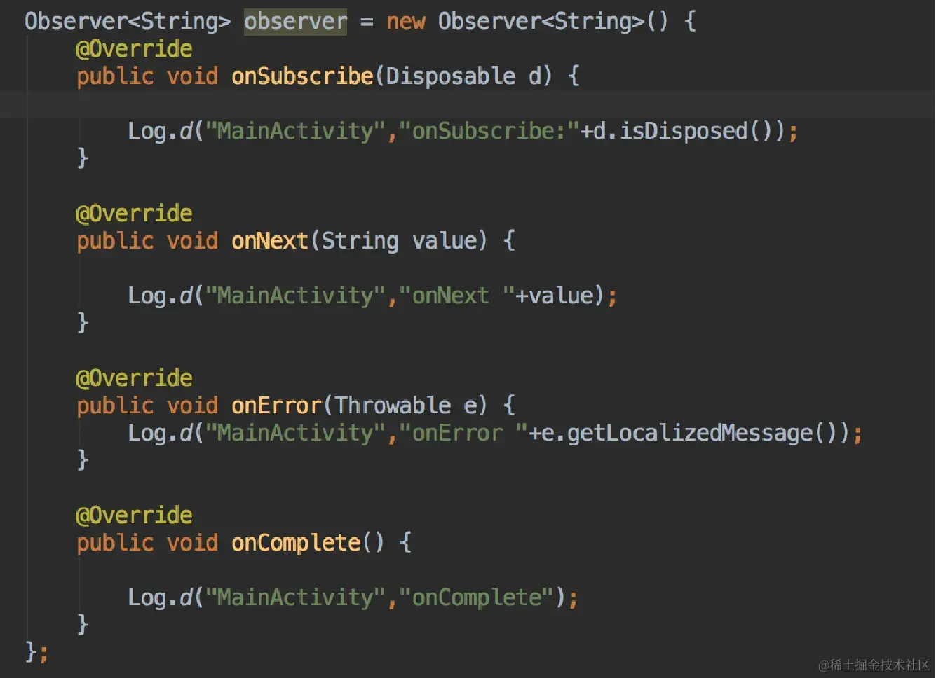 在订阅之后,Observer中,onSubscribe()是每次接收数据之前必须要调用的方法;onNext()则是对应Observable调用的次数去调用相应的次数;onComplete()、onError()对应完成/异常状态时候调用;