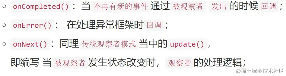 其中,onNext()、onComplete()、onError()三个方法分别对应着第一步中Observable的onNext()、onComplete()、onError()三个方法, 只要Observable发出(调用)对应的方法,Observer对应的方法就会被调用; -